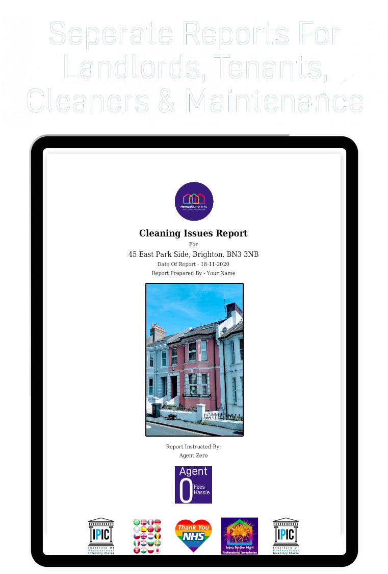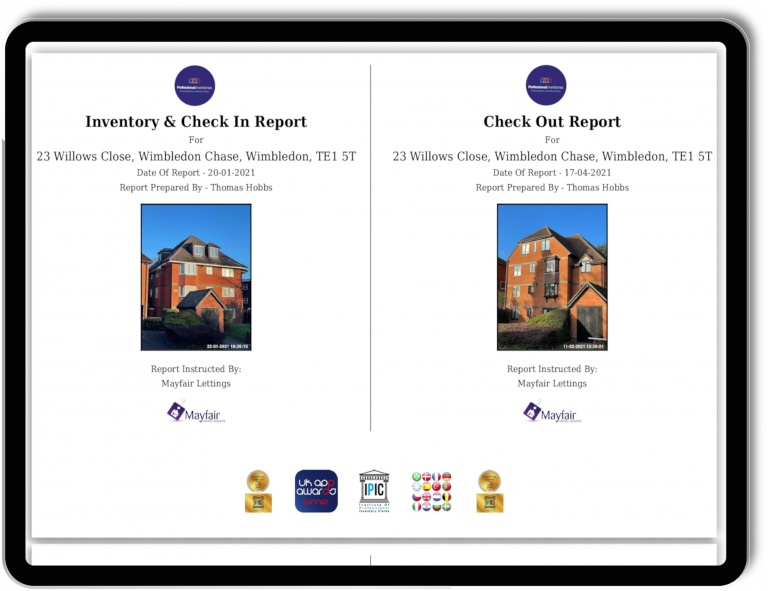Our Check Out Reports have a distinctive landscape format, with the original Inventory Report on the left and the new Check Out details on the right. This makes it easy and quick to compare ‘before’ and ‘after’ information – with text and evidential photos included. To make it even simpler, we only show Inventory information for items that are dirty, damaged, missing, etc, as there’s no need to read about items that haven’t changed during the tenancy